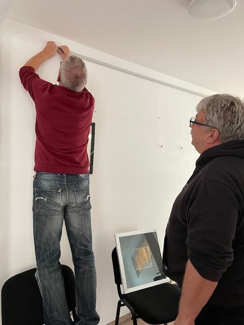 Die Bilder für die Ausstellung waren zusammengestellt und konnten heute gehängt werden. Dem Foyer widmeten wir uns zuerst. Anke, ihre Erfahrungen und die große Leiter waren uns eine große Hilfe. Nachdem die Fensterputzer in den Wandelgängen fertig waren und Bernd die Stellwände aufgestellt hatte, fanden die restlichen Werke ihren Platz. Am frühen Abend konnten wir dann einen ersten Eindruck von der Ausstellung gewinnen.