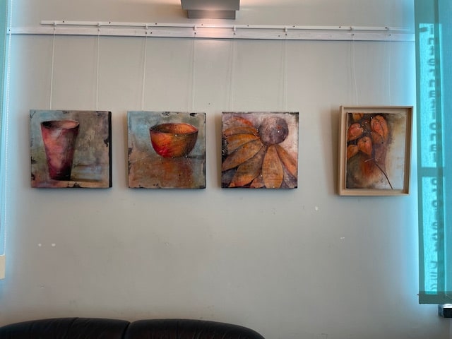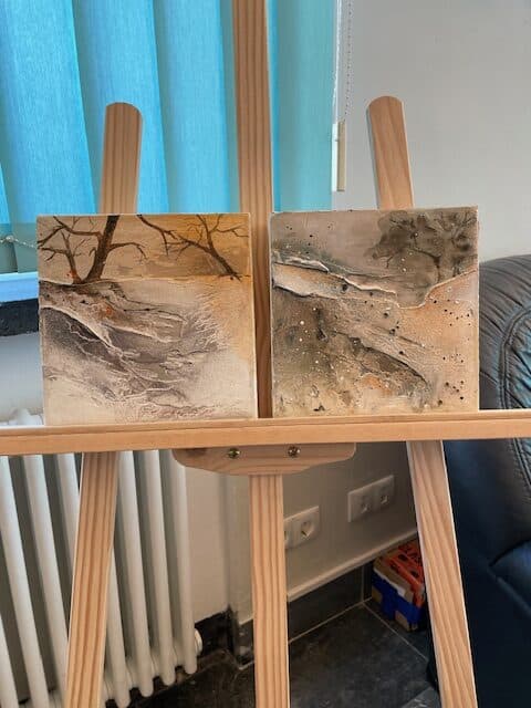 Wieder traf ich mich mit Teilnehmern zu einem Malkurs bei Jordis. Ich hatte mir einiges vorgenommen. Ein großes Format 80×80 habe ich Zuhause bereits vorbereitet. Das abstrakte Bild wollte ich hier beenden. Die kleinen Formate 20×20 reizen mich bereits seit längerer Zeit, fehlten mir teilweise geeignete Motive. Nun sind einige entstanden, weitere sind angelegt und warten auf Vollendung. Danke Jordis für die Einführung in die Verwendung von Eitempra und Pigmente.